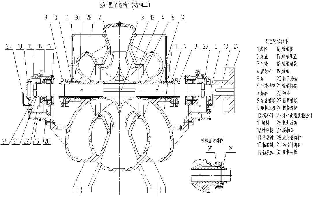 SA(SAM、SAF、SAP、SLA)型单级双吸中开离心泵输送的介质温度为-20℃--80℃,适用于输送各种工业用水、生活用水、自来水及水利工程,农田排灌等用途。 SA型用于输送清水或物理、化学性质类似于清水的液体。 SAM型用于输送含有一定量的固体颗粒的腐蚀性液体。 SAF型用于输送各类腐蚀性液体。 SAP型是在SA型泵的基础上吸收消化国外同类泵技术上改型和扩充的一个新品种。 ● 性能范围:流量:72--9900m³/h 扬程:6.8—104m 所有泵均可根据用户使用要求调整其运行参数。 ● 结 构:SA(SAM、SAF、SAP)型泵为卧式安装,吸入口与吐出口均在泵轴中心线下方,泵体水平中开,检修时不需折卸进、出水管路。 SLA为立式安装,吸入口和吐出口均在水平方向,泵体、泵盖的分开面在轴中心线上垂直分开。 轴承:泵两端均为滚动轴承(其中24SA--18、16SA--90可选用滑动轴承)支撑转子部件,稀油或油脂润滑。 轴封:①软填料密封;②机械密封从电机端看,泵逆时针旋转,也可按用户要求制成顺时针旋转。 ● 过流部件材质:泵的过流部件材质均为铸铁,如用户需要可采用铸钢和铜制造,但需要在合同中注明。 ● 型号说明:例:10SA(SAP、SAM、SAF、SLA)--6A 10一吸入口径被25除(即吸入口径为250mm) SA--单级双吸离心清水泵 SAP--SA改进泵 SAM--耐磨型单级双吸离心泵 SAF--耐腐蚀型单级双吸离心泵 SLA--立式单级双吸离心泵 6--比转数被10除化整的约数 A--叶轮第一次切割 结构说明: SAP型系列泵结构见图所示 1、本型泵壳体部分主要由泵体、泵盖、密封环等零件组成,泵为卧式安装,泵壳于轴心线处分开,上部为泵盖,下部为泵体,吸入口和吐出口均在泵轴线下方的泵体上,其中心线与轴线垂直。检修时不需拆卸进水和出水管路,即可揭开泵盖,取出转子部件进行检修和更换有关零件。 2、转子部件由轴、叶轮、轴套、挡水圈、锁紧螺母等零件组成,轴上零件均由两端圆螺母锁紧,并将整个主轴保护起来,从而提高轴的使用寿命,转子上轴向力由叶轮自身平衡,剩余轴向力由滚动轴承承受。 3、轴承采用滚动轴承、干油润滑。轴承装在轴承衬套上成为一体,便于轴上零件的更换。轴际端盖密封采用骨架油封。 4、轴封采用软填料密封和机械密封两种形式,供用户选择。 填料密封由填料套、填料环、填料和填料压盖等零件组成。填料部位的冷却、润滑均由水封管部件通过引用泵内自身水完成。 机械密封由非平衡型机械密封部件和压盖等零件组成。 机械密封部位的冲洗、冷却水由水封管部件通过引用泵内自身水完成,也可接用外来水完成。 5、水封管部件由水封管、弯头、和闸阀组成。 6、本系列泵采用弹性柱销联轴器由电机直接驱动。 7、泵的旋转方向,从电机端向泵看,为逆时针方向旋转,即吸入口在左,吐出口在右。 根据用户要求,也可将驱动端移到泵的另一端。此时,转向和吸入、吐出口方向均与上述相反。 泵 型 号 装配部位 轴 承 名 称 轴承规格 数 量 轴承体结构型式 6SAP-6 从动端 深沟球轴承 310 1 结构一 驱动端 深沟球轴承 310 1 6SAP-8 8SAP-10 从动端 深沟球轴承 308 1 驱动端 深沟球轴承 308 1 8SAP-7 从动端 深沟球轴承 312 1 驱动端 深沟球轴承 312 1 10SAP-6 12SAP-10 从动端 深沟球轴承 316 1 驱动端 深沟球轴承 316 1 12SAP-4 从动端 深沟球轴承 6316 1 结构三 不带轴承内套 驱动端 深沟球轴承 6316 1 14SAP-4 从动端 深沟球轴承 6319 1 结构三 不带轴承内套 驱动端 单列向心短圆柱滚子轴承 NU319 1 14SAP-10 14SAP-20 从动端 深沟球轴承 316 1 结构一 驱动端 深沟球轴承 316 1 16SAP-9J 从动端 深沟球轴承 319 1 驱动端 单列向心短圆柱滚子轴承 32319 1 16SAP-10 从动端 深沟球轴承 318 1 结构二 驱动端 深沟球轴承 318 1 16SAP-13 从动端 深沟球轴承 313 1 结构三 不带轴承内套 驱动端 深沟球轴承 313 1 20SAP-4 从动端 深沟球轴承 6326 1 结构三 不带轴承内套 驱动端 单列向心短圆柱滚子轴承 NU326 1 20SAP-5 从动端 深沟球轴承 326 1 结构二 不带轴承内套 单列向心短圆柱滚子轴承 2326 1 驱动端 单列向心短圆柱滚子轴承 NU326 1 20SAP-6 从动端 深沟球轴承 326 1 结构二 单列向心短圆柱滚子轴承 NU326 1 驱动端 单列向心短圆柱滚子轴承 NU326 1 20SAP-10 从动端 深沟球轴承 324 1 结构一 驱动端 单列向心短圆柱滚子轴承 32324 1 20SAP-14 从动端 深沟球轴承 324 1 驱动端 单列向心短圆柱滚子轴承 32324 1 20SAP-20 20SAP-22 从动端 深沟球轴承 316 1 驱动端 深沟球轴承 316 1 20SAP-28 从动端 深沟球轴承 316 1 驱动端 深沟球轴承 316 1 24SAP-6 从动端 深沟球轴承 328 1 结构二 单列向心短圆柱滚子轴承 32328 1 驱动端 单列向心短圆柱滚子轴承 32328 1 24SAP-10 从动端 深沟球轴承 324 1 结构一 驱动端 深沟球轴承 324 1 轴承型号及规格表二 泵 型 号 装配部位 轴 承 名 称 轴承规格 数 量 轴承体结构型式 24SAP-14 从动端 深沟球轴承 324 1 结构一 驱动端 单列向心短圆柱滚子轴承 32324 1 24SAP-18 从动端 深沟球轴承 324 1 驱动端 单列向心短圆柱滚子轴承 32324 1 24SAP-28 从动端 深沟球轴承 319 1 驱动端 单列向心短圆柱滚子轴承 32319 1 26SAP-10 从动端 深沟球轴承+单列向心短圆柱滚子轴承 6326 NU326 各1 结构二 驱动端 单列向心短圆柱滚子轴承 NU326 1 28SAP-9J 从动端 深沟球轴承 330 1 结构一 驱动端 深沟球轴承 330 1 28SAP-12 从动端 深沟球轴承 6326 1 结构三 驱动端 单列向心短圆柱滚子轴承 NU326 1 28SAP-25 从动端 深沟球轴承 319 1 结